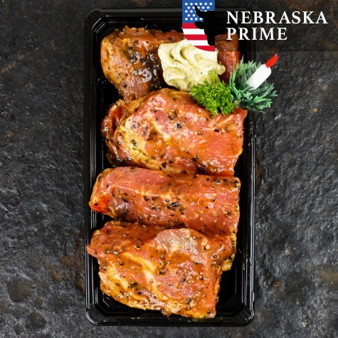 Rib eye van het Amerikaanse Black Angus rund, speciaal op maat gesneden voor de gourmet. De ribeye is gemarineerd met een 4 pepers/zeezout marinade. Er zitten vier steaks in een gourmetbakje. U krijgt het bevroren gevacumeerd aan. Ontdooi een dag vantevoren in de koelkast en presenteer op het meegeleverde gourmetschaaltje of op uw eigen schaal, naar wens garneren voor een leuke presentatie. De foto is een indicatie hoe het eruit kan komen te zien.