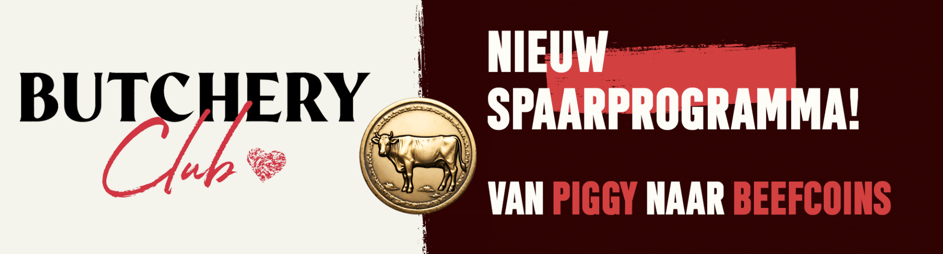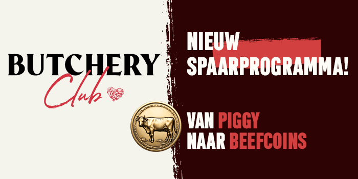 We stappen over van ons oude spaarsysteem met Piggy punten naar een nieuw en uitgebreider systeem: The Butchery Club met Beefcoins. Met dit systeem kan je zowel in de winkel als online sparen en heb je een shop waar je jouw gespaarde punten direct kan uitgeven.