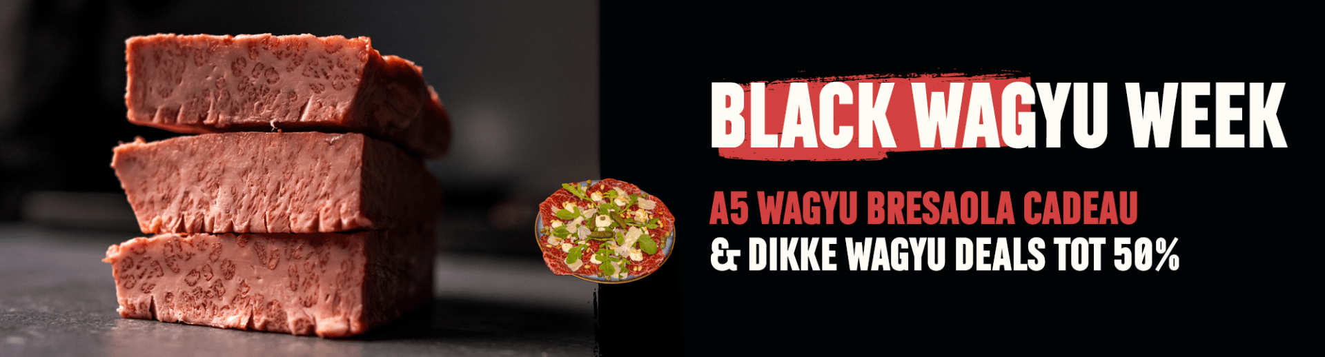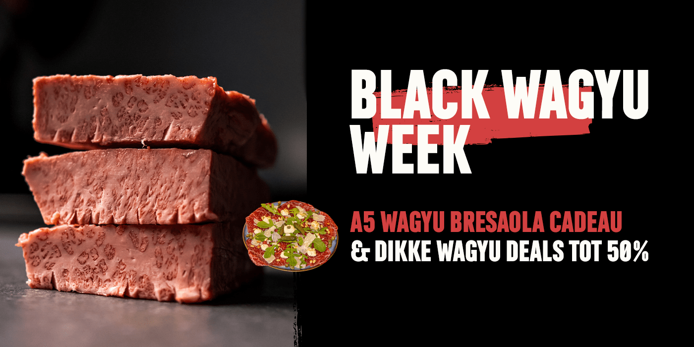 Het is Black Wagyu Week bij The Butchery en dat betekent dat we een A5 Wagyu Carpacio de Bresaola gratis weggeven bij besteding vanaf 150,- aan vlees. Daarnaast geven we dikke kortingen op wagyu vlees tot wel 50%!